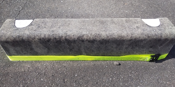 そのため、車止めの左右に下記のような感じで黄色の荷造りベルトを巻いています。