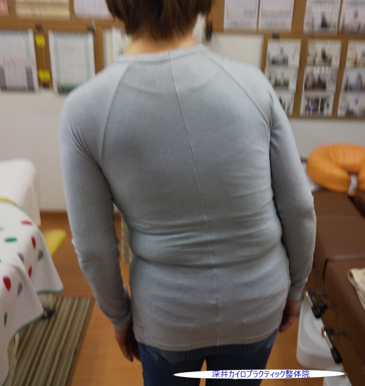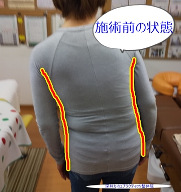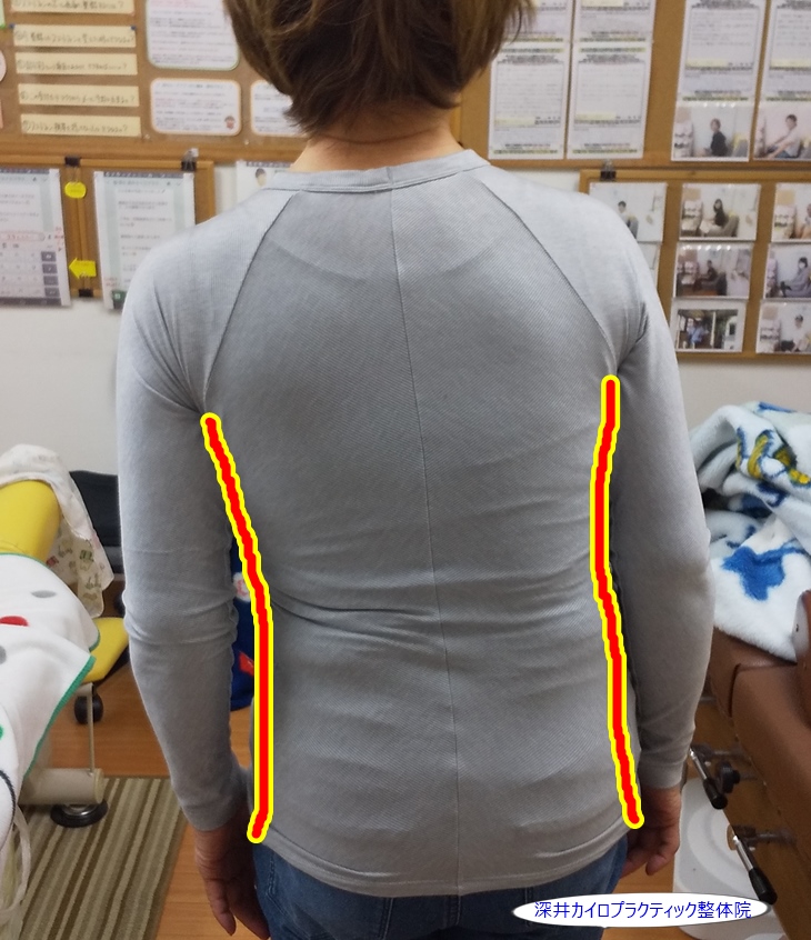 後ろから腰の動きの状態などを確認しますが、立位の姿勢で下記の写真のようにかなり左側にカラダが傾斜されていることがよく分かります。
