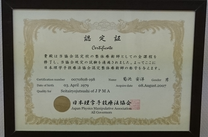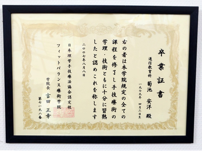 2007年8月8日卒業日本理学手技療法協会認定 整体療術師